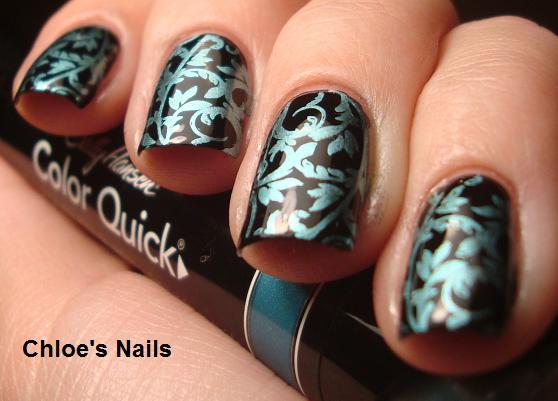 Good morning ladies!! This is a mani I did last week, pre-break, I'm still so mad, lol. For this I used Sinful's Black on Black for the base, and a Sally Hansen Color Quick Chrome polish pen, in Turquoise Chrome, for the image. I used the Bundle Monster plate BM20. These Sally Chrome polish pens, work GREAT for stamping!!